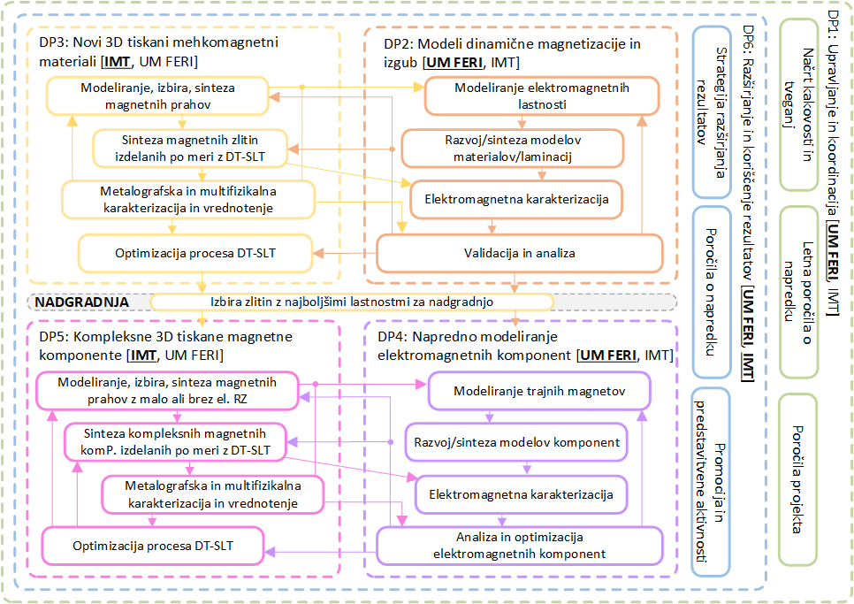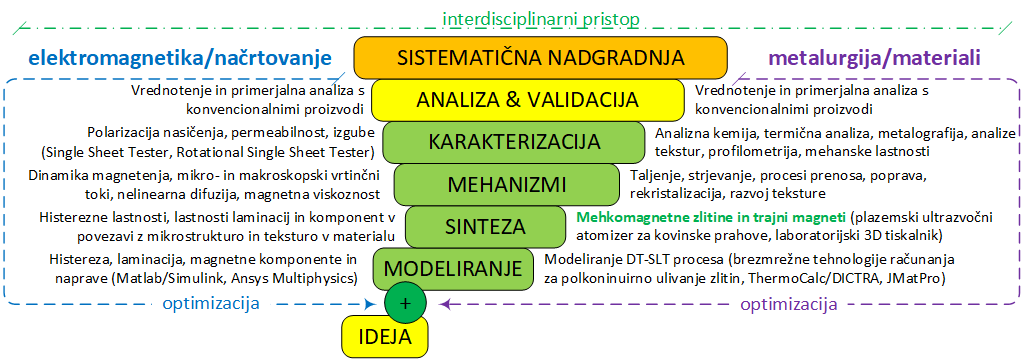 Glavni cilj je razvoj novih mehkomagnetnih materialov na osnovi zlitinskih sistemov Fe-Si-X (X = Al, Mn in/ali P, Sn, Sb ...) s postopki DT, ki omogočajo specifične elektromagnetne lastnosti materiala in geometrijo po meri, za optimalno prilagojenost načrtovanim električnim napravam. Vse to vključuje analizo in optimizacijo postopkov izdelave materialov in komponent z DT z vidika metalurgije/materialov in z vidika elektromagnetike/načrtovanja električnih naprav.
