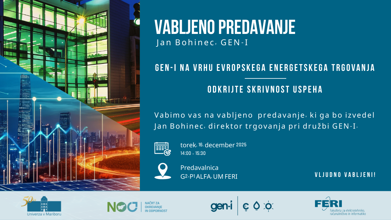 Inštitut za močnostno elektrotehniko, UM FERI vabi na gostujoče predavanje, kjer bomo skupaj z Mag. Djordje Žebeljanom, predstavnikom Službe za energetske politike in EU zadeve ter pomočnikom vodje službe v podjetju Holding Slovenske elektrarne d.o.o., razpravljali o aktualnih usmeritvah energetske politike, izzivih zelenega prehoda, ter o tem, kako lahko s povezovanjem znanj in izkušenj prispevamo k bolj trajnostnemu energetskemu sistemu.