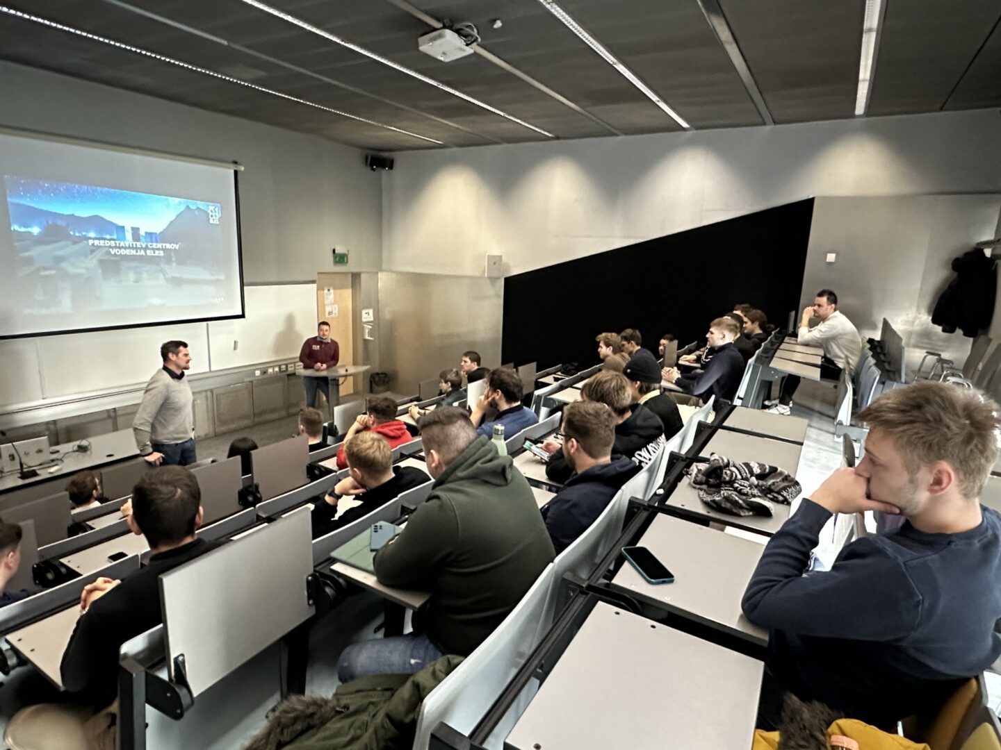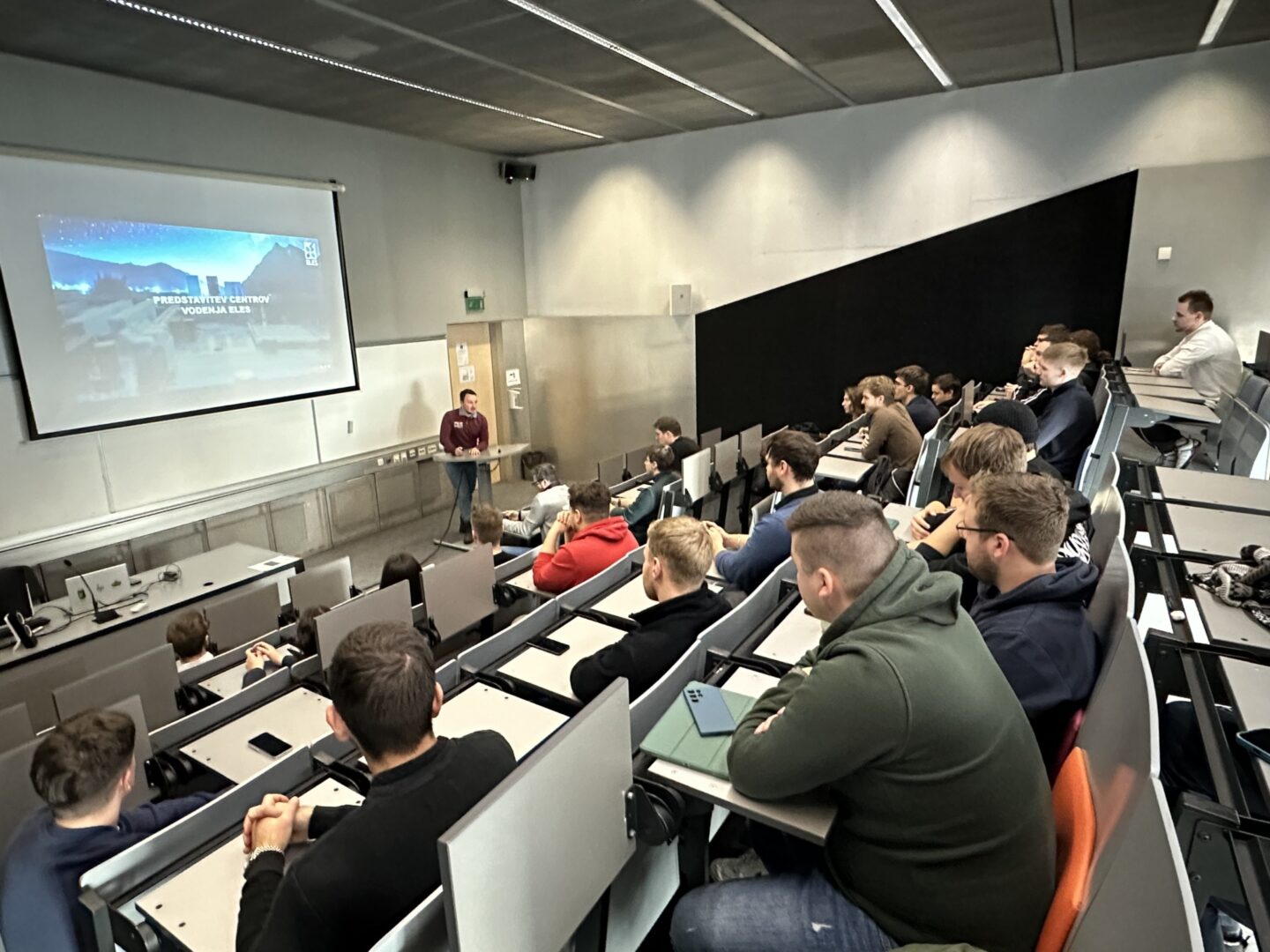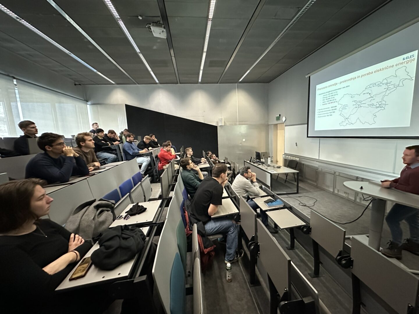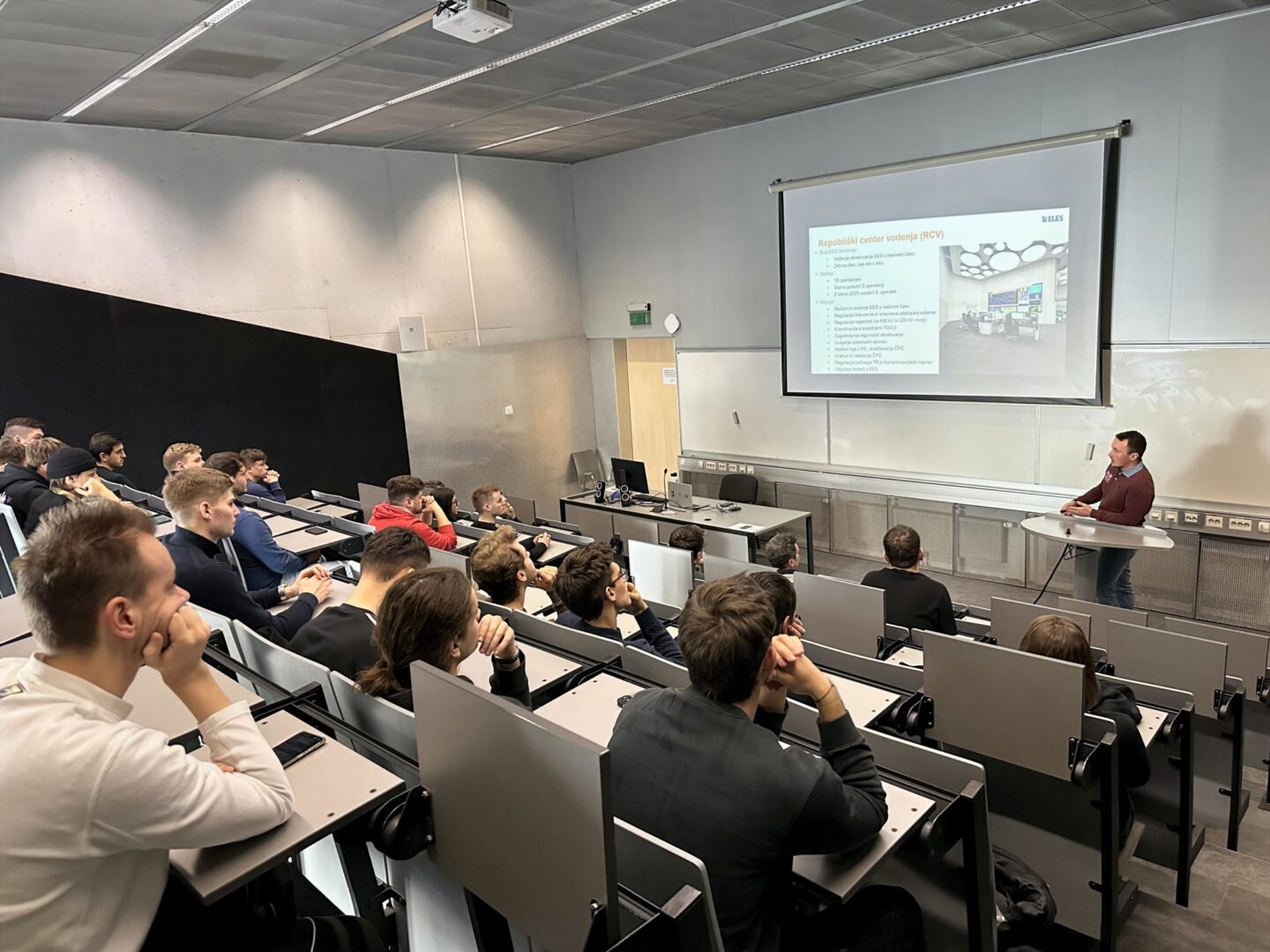 V četrtek, 8. januarja 2026, so študentje Močnostne elektrotehnike UM FERI, v okviru predmeta Elektrarne in električna omrežja prisluhnili vabljenemu predavanju, ki ga je izvedel Jaka Rober, mag. inž. el., ki v Republiškem centru vodenja družbe ELES opravlja delo Samostojnega inženirja za kratkoročno planiranje in obratovanje.